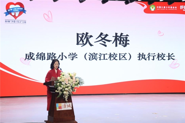 成绵路小学(滨江校区)执行校长欧冬梅在捐赠仪式上表示:“衷心感谢中国儿基会和舒客宝贝为我校学生带来这份珍贵的口腔健康礼物。这批优质的口腔护理用品不仅体现了爱心企业对孩子们健康成长的关怀,更承载着全社会对儿童健康事业的重视。”