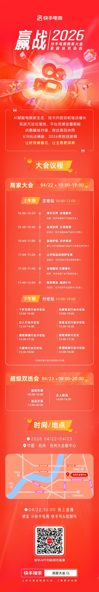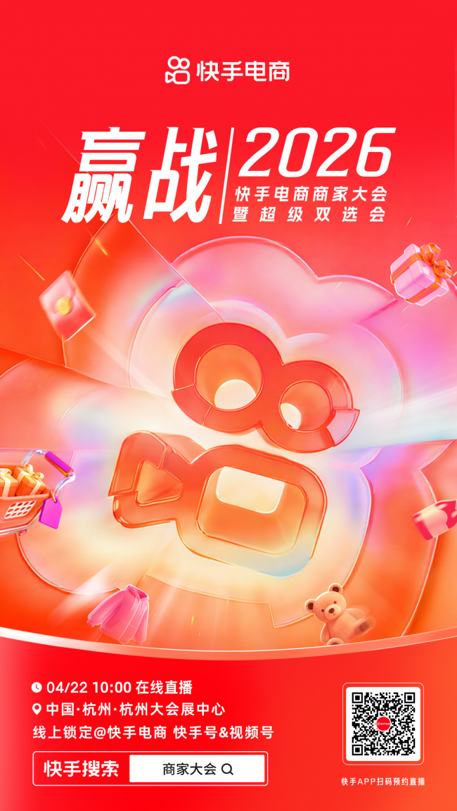 4月22日至23日,"赢战2026"快手电商商家大会暨超级双选会将于杭州启幕。届时,快手电商各业务线负责人将齐聚现场,围绕产品能力、分销体系、运营策略等维度展开深度分享,系统呈现快手电商生态的最新发展成果,全面阐释全域经营的增长势能,并发布2026年618大促的全周期节奏与平台政策,助力品牌、商家及达人等生态伙伴精准备战、制胜大促。